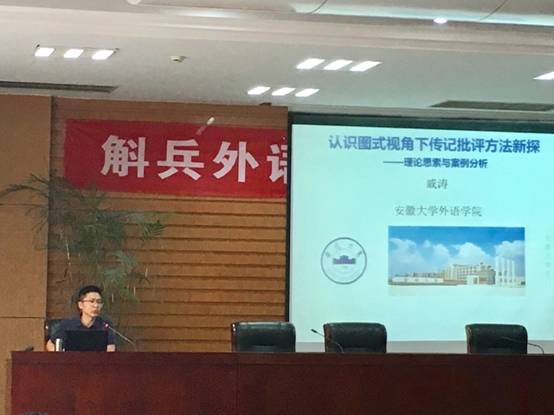 2017年6月28日下午两点半,williamhill官网于屯溪路校区建筑设计研究院三楼报告厅成功举办了2017年斛兵外语讲坛第6场学术报告会。安徽大学外语学院教授、博士生导师戚涛教授带来了题为“认识图式视角下传记批评方法新探——理论思索与案例分析”的讲座,众多教师和在校研究生到场聆听与学习。