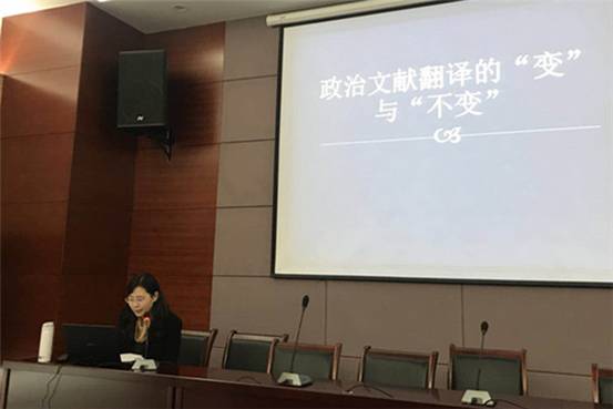 随后,宋虹老师讲到,政治文献翻译是“融通中外”的桥梁,是他国及他国人了解我国国情、政策方针、政治制度、政治立场等最权威的来源。随着我国国际地位不断提升,国际影响力、感召力、塑造力显著提高,对外宣传的力度进一步加大,政治文献翻译变得越发重要。以我为本、厘清认识,才能讲好中国故事,助力中国梦的实现。十九大是引领时代发展的宣言书,语言自信、有力、态度坚定、气势磅礴。如何再现语体风格,让全世界感受到十九大报告背后的决心以及其中包含的重要思想,宋虹老师结合十九大报告翻译中的实例,生动阐述了翻译的基本策略,对翻译过程中重要术语的创新、修辞的处理及用词的政治意义进行了一一解读,这对于增强我国的大国话语权,以及提升国家形象,具有重要意义。