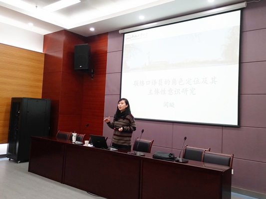 闵璇老师带来了题为“联络口译员的角色定位及其主体性意识研究”的精彩学术报告。首先,闵老师针对口译中学生常问问题,做出汇总,清晰明确,极大激发了学生的求知欲。其次,通过简要对比联络口译与会议口译的区别,闵老师指出学习联络口译的必要性,循循善诱,因势利导。闵璇老师主要从联络口译员的角色定位和口译员的主体性意识研究两个方面进行讲解。她将理论与实例相结合,既形象贴切又简单明了,有效丰富了同学们的理论知识。最后,通过探讨译者在翻译中的角色和身份,闵璇老师希望同学们能培养参与的灵活性和主动性,同时提高对宏观大局的把握和微观形势的协调掌握能力,令在场同学收获颇丰。在学生汇报中,陈凤同学展示了近期的学术成果,闵老师作了精彩点评并建议她完善思路,不断提升。