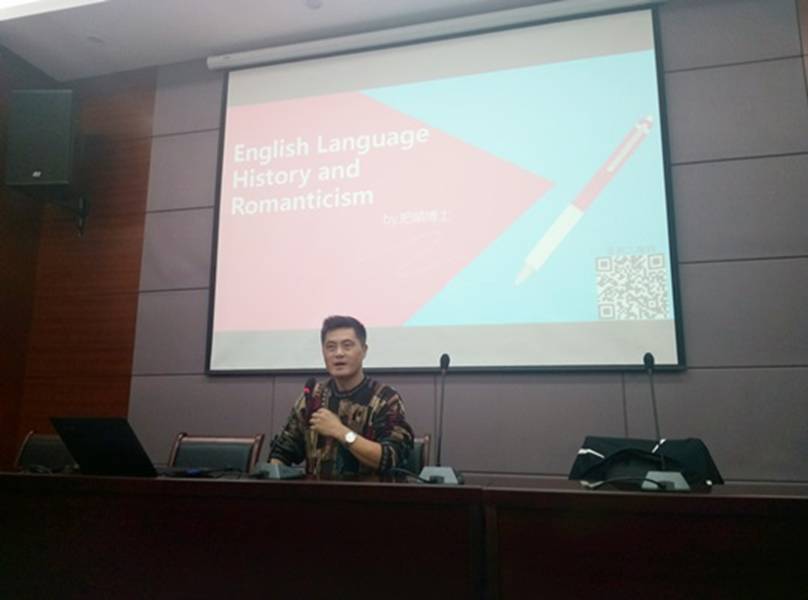 以“English Language History and Romanticism”为主题,把嶙博士为同学们带来了一场精彩的学术报告。从宇宙的起源,到语言的诞生;从罗马帝国的入侵,到美洲大陆的发现,把嶙博士结合历史人文的发展,阐述了英语语言的来龙去脉,以及英语和其他语言的融合与发展。接着,把嶙博士介绍了浪漫主义的时代历史和人文社会背景,并为大家声情并茂地朗诵了Wordsworth的一首浪漫主义代表作I Wandered Lonely as A Cloud。最后,把嶙博士同大家分享了近期创作的一些诗歌作品,并讲述作诗的灵感与心境,精巧的措辞、优美的韵律,不仅陶冶了同学们的情操,更是在大家心中埋下了诗歌的种子。