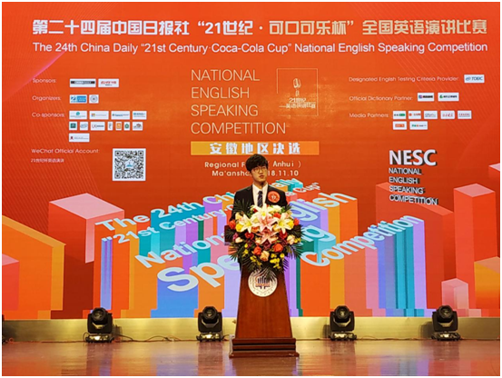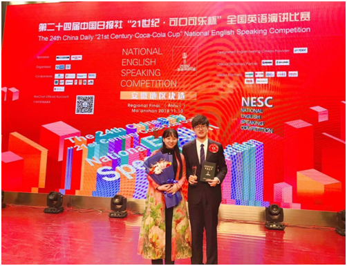 由中国日报社、可口可乐大中华区联合主办的第二十四届中国日报社“21世纪·可口可乐杯”全国英语演讲比赛安徽赛区决赛于2018年11月10日在安徽工业大学圆满结束。来自williamhill中国官方网站英语专业2016级刘子源和胡近涵两名选手经过校级初赛选拔,脱颖而出,最终代表WilliamHill官方网站参加省赛,并分别取得亚军和二等奖的佳绩。亚军获得者刘子源同学将代表安徽省参加明年三月的国赛。