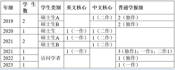 期刊论文 Zhang, Sihong & Chen, Jie. 2024. A typological study on person sensitivity in Ersu. Asian Language and Linguistics. 5.2:337-357.(源期刊高水平论文;通讯作者) Dong, Liying, Wang Yalan & Zhang, Sihong. 2024. Multilingualism in the Andes: policies, politics, power. Journal of Language and Politics. DOI: 10.1075/jlp.24053.don(源期刊高水平论文;通讯作者) Liu, Yifan & Zhang, Sihong. 2023. The essence of linguistic analysis, an integrated approach. Folia Linguistica. DOI:10.1515/flin-2023-2005(源期刊高水平论文;通讯作者) Mei, Shuqi, Wang Yalan & Zhang, Sihong. 2023. English in East and South Asia: policy, features and language in use. Journal of Multilingual and Multicultural Development. DOI:10.1080/01434632.2023.2168931(源期刊高水平论文;通讯作者) Wang, Jing & Zhang, Sihong. 2022. Cross-cultural learning: a visualized bibliometric analysis based on Bibliometrix from 2002 to 2021. Mobile Information System. https://doi.org/10.1155/2022/7478223. (源期刊高水平论文) Liu, Suya & Zhang, Sihong. 2021. A bibliometric analysis of computer-assisted English learning from 2001 to 2020. International Journal of Emerging Technologies in Learning. 16.14:12-27. (源期刊高水平论文;通讯作者) Zhang, Shuyu & Zhang, Sihong. 2019. Experimental study on a two-string lexical decision task: non-words and words. iJES. 7.4:77-84. Zhang, Sihong. 2016. Mobile college English teaching: an empirical study on an APP, English Fun Dubbing. iJET. 15.1:1-8. (源期刊高水平论文) Zhang, Sihong. 2014. Numeral classifiers in Ersu. Language and Linguistics. 15.6: 883-915.(源期刊高水平论文) 张四红,梅书琪. 2023. RCEP区域伙伴国家语言安全建设的实践路径[J]. 当代外语研究 54-64. (源期刊高水平论文) 张四红,胡爽. 2023. RCEP框架下的我国外语高等教育:现状分析与路径优化[J]. 外语学刊16-24. (源期刊高水平论文) 张四红,耿静静. 2023. 总体国家安全观视域下的边疆和谐语言生活构建[J]. 北京第二williamhill中国官方网站学报 172-173. (源期刊高水平论文) 张四红,江榕,李梦媛,吴纪琛. 2023. 新中国成立以来我国外语教育政策与文化自信的互动研究[J]. 语言政策与规划研究 47-56+178-179. (源期刊高水平论文) 张四红,解丽丽. 2022. 尼泊尔的藏裔族群及藏语方言研究[J]. 中国藏学. 155.6:161-173+219.(源期刊高水平论文) 张四红,董理颖. 2022. 印度尼西亚国际中文教育的本土化路径研究[J]. 云南师范大学学报(对外汉语教学与研究版).20.6:9-18.(AMI扩展版期刊论文) 张四红,刘一凡. 2021. 中国与周边“一带一路”沿线国家的跨境语言类型及治理[J]. 云南师范大学学报(哲学社会科学版). 53.3:95-103.(源期刊高水平论文) 张四红. 2020. 尼泊尔的语言国情及中国西藏边境地带语言安全构建[J]. 南亚研究. 2020.3:39-58+157.(源期刊高水平论文) 张四红. 2020. 中国周边跨境语言研究国际学术话语权的构建[J]. 语言文字应用. 2020.2:27-36.(源期刊高水平论文) 张四红. 2020. 语言服务于国家应急管理的基础性作用研究[J]. 宿州学院学报. 35.6:40-42. 张四红. 2019. 沉浸田野矢志不渝,痴迷语言著述等身——澳大利亚詹姆斯·库克大学语言与文化研究中心R. M. W Dixon教授访谈录[J]. 常熟理工学院学报. 2019.6:79-84. 张四红, 孙宏开,王德和.2018. 尔苏语形容词的词类独立性研究[J].语言研究,38.1:107-117.(源期刊高水平论文;《中国社会科学网》全文转载) 张四红,余成林. 2017. 尔苏语的存在类和领有类动词及其类型学启示[J].民族语文,2017.3:53-67. (源期刊高水平论文) 张四红, 王轩.2017. 越西尔苏语以动词为基式的重叠式研究[J].中央民族大学学报(哲学社会科学版),44.2:163-169. (源期刊高水平论文) 张四红等. 2017. 互联网+时代的中医药跨文化传播[J]. 时珍国医国药,28.5:1277-1280. (源期刊高水平论文) 张四红. 2017. 基于对等沟通理论的英语混合式教学研究[J]. 重庆科技学院学报(人文社会科学版),2017.3:103-106. 张四红等. 2016. 中医药大学内涵建设和国际化战略[J]. 淮北师范大学学报(哲学社会科学版),37.3:129-132. 张四红,程玲. 2011. 基于Multi-Conc的英语词汇自主学习研究[J]. 现代教育技术,21.8:60-65.(源期刊高水平论文) 张四红等. 2011.基于AntConc的英语词汇教学研究——以《大学英语(精读)》课文文本为例[J]. 长江大学学报(社会科学版),34.12:93-96. 张四红. 2010. 农村大学生英语听力状况的调查研究[J]. 教育理论与实践,30.3:52-54.(源期刊高水平论文) 学生指导相关要求 课题组计划每年招收青年访问学者0-1名,学术型硕士和翻译专业型硕士各1-2名。建议青年访问学者和学术型硕士从事语言类型学和语言政策与规划方面的研究,建议翻译专业型硕士合作(或独立)翻译一本中文或英文专著,同时也鼓励学生结合自身研究兴趣进行自由探索,敬请提前通过邮件联系商谈学习方向和计划。 学生学术成果统计 结束访学青年访问学者以及已毕业学术型硕士在学期间学术成果统计: