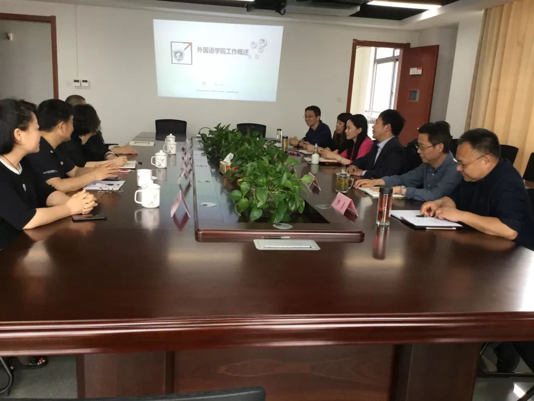 2019年4月26日,新疆农业大学外语学院马琴院长携黄川副院长(援疆干部),新疆维吾尔自治区高校外语教学研究会会长徐世昌教授,大外部王婷主任,英语专业唐彬主任来到WilliamHill官方网站翡翠湖校区williamhill中国官方网站进行调研,座谈,参加会议的有韩江洪院长、胡丹书记、杨勇副院长、唐军副院长,英专陈曦主任以及刚援疆回来的大外部胡安琳主任。首先韩江洪院长介绍了学院的基本情况,随后对英语专业“以能力为导向的”人才培养模式、大学英语教学研究、研究生培养、师资队伍建设以及学术研究等方面的成功经验做了交流发言,双方就教学、科研的相关问题也进行了探讨,随后,考察成员参观了外语学院同声传译实训室、 各系部教研室、党建活动室、以及心理咨询室等。最后,双方代表希望今后在大学英语教学改革、专业建设、党建工作等各个方面能有更加深入的交流和合作。