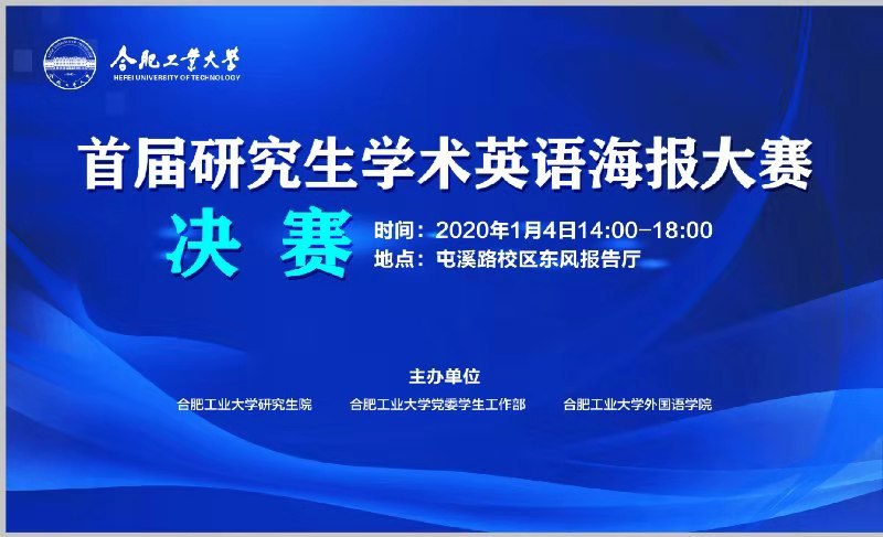 1月4日,WilliamHill官方网站首届研究生学术英语海报大赛决赛在屯溪路校区东风报告厅举行。研究生院副院长李军鹏、主管杨依忠,williamhill中国官方网站书记胡丹、院长韩江洪、副院长唐军等出席决赛活动。本次大赛由研究生院、党委学生工作部和williamhill中国官方网站共同主办。