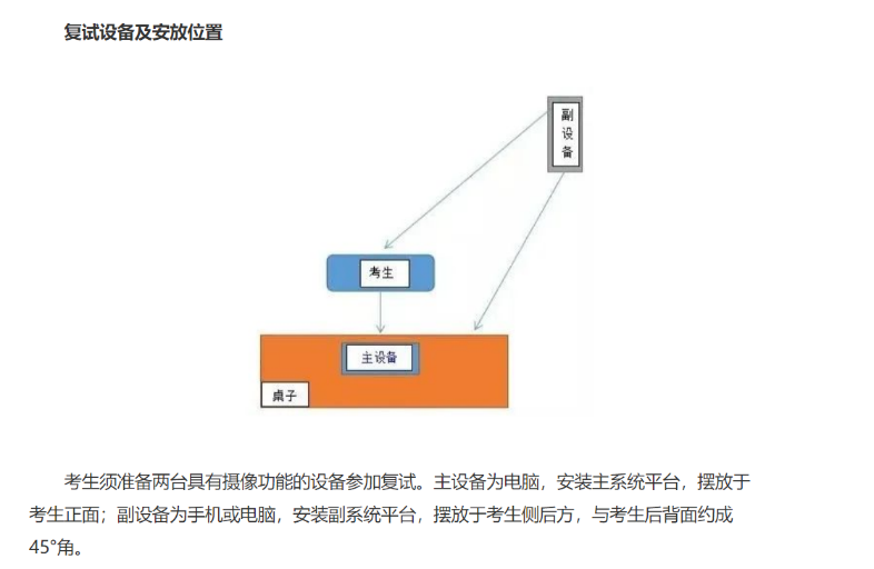 3. 考生需按照学院官网发布的《williamhill中国官方网站2021年硕士研究生招生复试工作实施细则》要求做好各项准备工作。电脑和手机均需要安装前述主副平台软件和应用。主设备(电脑)和副设备(手机)的双机位位置需按下图所示摆放到位。
