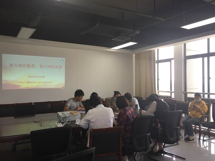 为深入开展党史学习教育,落实立德树人的根本任务,积极推动研究生英语教学改革,充分发挥学术英语在研究生教育培养中的支撑作用,回应学生对语言服务的迫切需求,williamhill中国官方网站研究生外语教学系党支部于5月8日上午九点在翡翠科教西楼1309室开展“致力语言服务, 助力学科发展”----“我为师生办实事”党史学习教育活动。