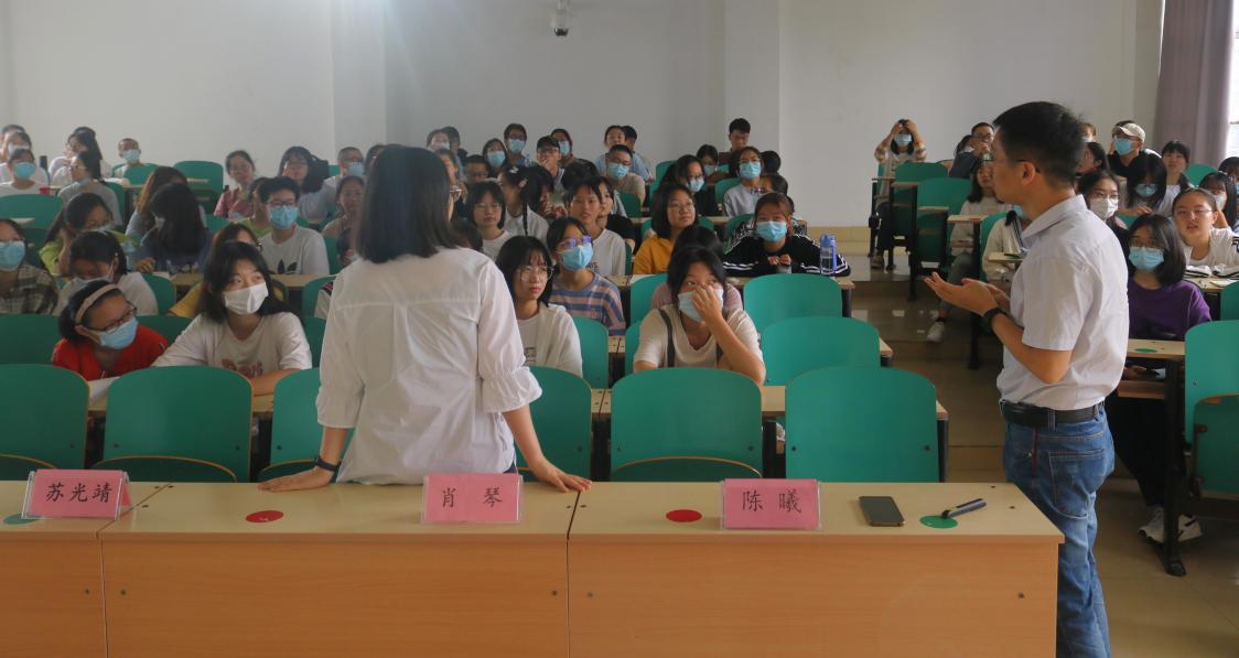 外语系主任陈曦首先以“专业与大学——知识、能力与素质”为主线开始为新生进行讲解,就“什么是专业(知识)”、“大学学什么(能力)”及“大学的意义(素质)”三点与新生们展开热烈讨论。讲座过程中,陈曦对2021级新生未来的学习与发展满怀期盼,同时也对同学们提出了一些建议,希望同学们都能在大学生活中有所学、有所成。最后,陈曦以一句“不忘初心,方得始终”作为结语,再一次表达了对2021级新生成人、成才的强烈期望。