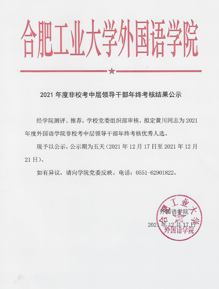 2021年williamhill中国官方网站非校考中层领导干部年终考核优秀人选公示