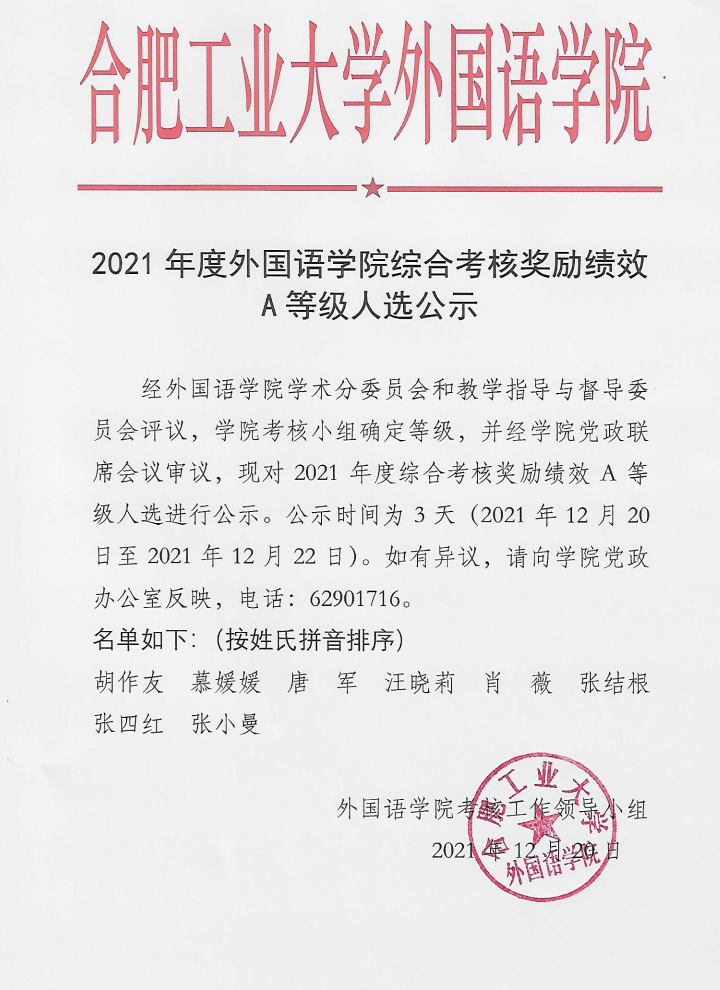 2021年度williamhill中国官方网站综合考核奖励绩效A等级人选公示