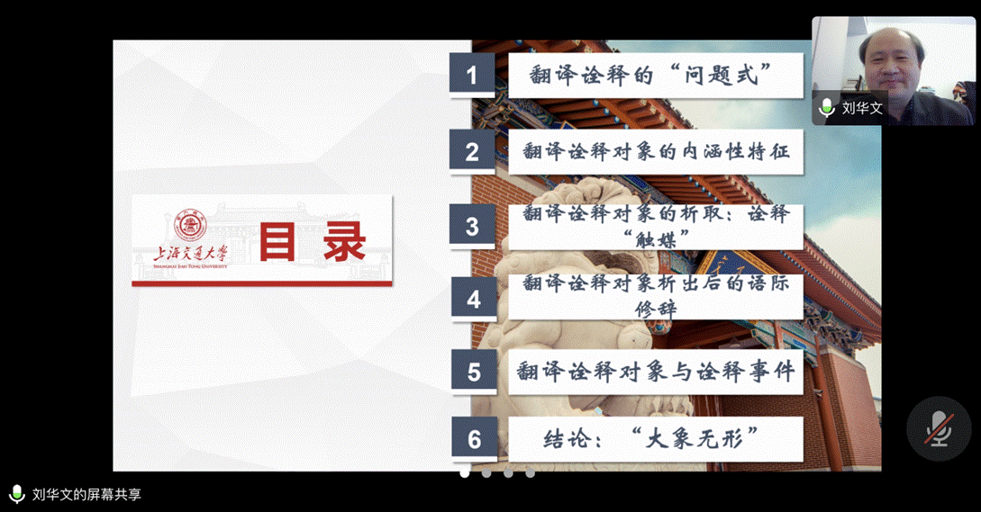 为更好地提升师生科研水平,12月12日上午,williamhill中国官方网站跨文化传播与科技翻译研究中心特邀上海交通大学博士生导师刘华文教授做了一场题为“典籍翻译诠释的对象性问题”的讲座。本次讲座通过腾讯会议(会议号986 881 786)线上进行。跨文化传播与科技翻译研究中心成员、学院部分教师和研究生数十人聆听了讲座。讲座由研究中心主任韩江洪教授主持。