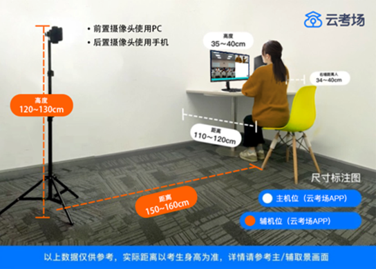 移动云考场平台作为复试主平台,复试小组的提问和考生的回答均在本系统进行。考虑到手机屏幕小、来电阻断等问题,原则要求使用电脑安装主平台作为主设备,摆放于考生正面,复试全程开启,摄像头正对考生。复试过程中,要求视频中考生双手和头部全程在视频录像范围。