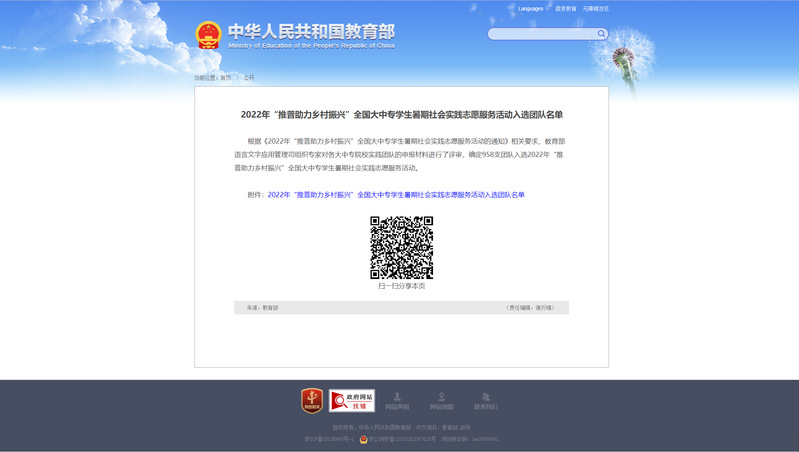 近日,由教育部语言文字应用管理司、共青团中央青年发展部开展的2022年暑期“推普助力乡村振兴”全国大中专学生暑期社会实践志愿服务活动相关申报工作已全部结束。经过评审专家委员会对各大中专院校实践团队的申报材料进行评审,确定出最终的入选团队。其中由williamhill官网张四红老师、陈睿老师、赵雰雰老师所指导的2020级本科生谭诗怡等同学的“赴安徽省利辛县陈营村推普助力乡村振兴服务队”三下乡队伍获批立项,是williamhill官网本科生首次获得教育部及共青团中央开展的三下乡活动立项资格。