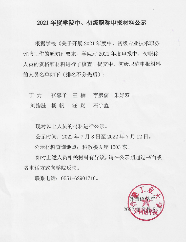2021年度学院中、初级职称申报材料公示