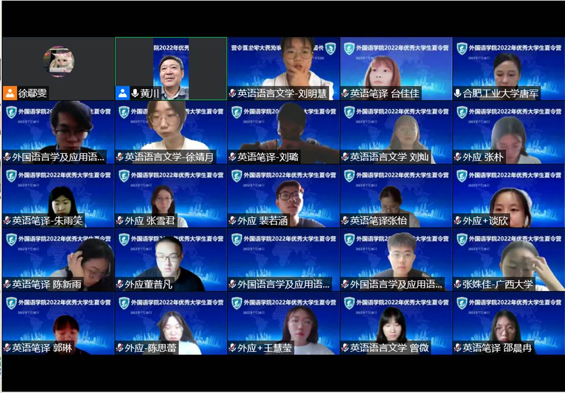 7月18日上午8:30,夏令营如期举行,全体营员相聚“云端”,共同参加学院结合学科优势精心组织的内容丰富的各项活动。黄川教授致欢迎辞,唐军教授从招生规模、师资队伍、学科方向、人才培养、科学研究、学术交流等方面全面介绍了williamhill中国官方网站的基本情况,重点就学院2022年研究生招生录取情况及2023年招生政策进行了详细的解读。她真诚期待来自全国各地的优秀学子加入外国语学院的大家庭,也祝愿各位营员能如愿所偿,学有所成。
