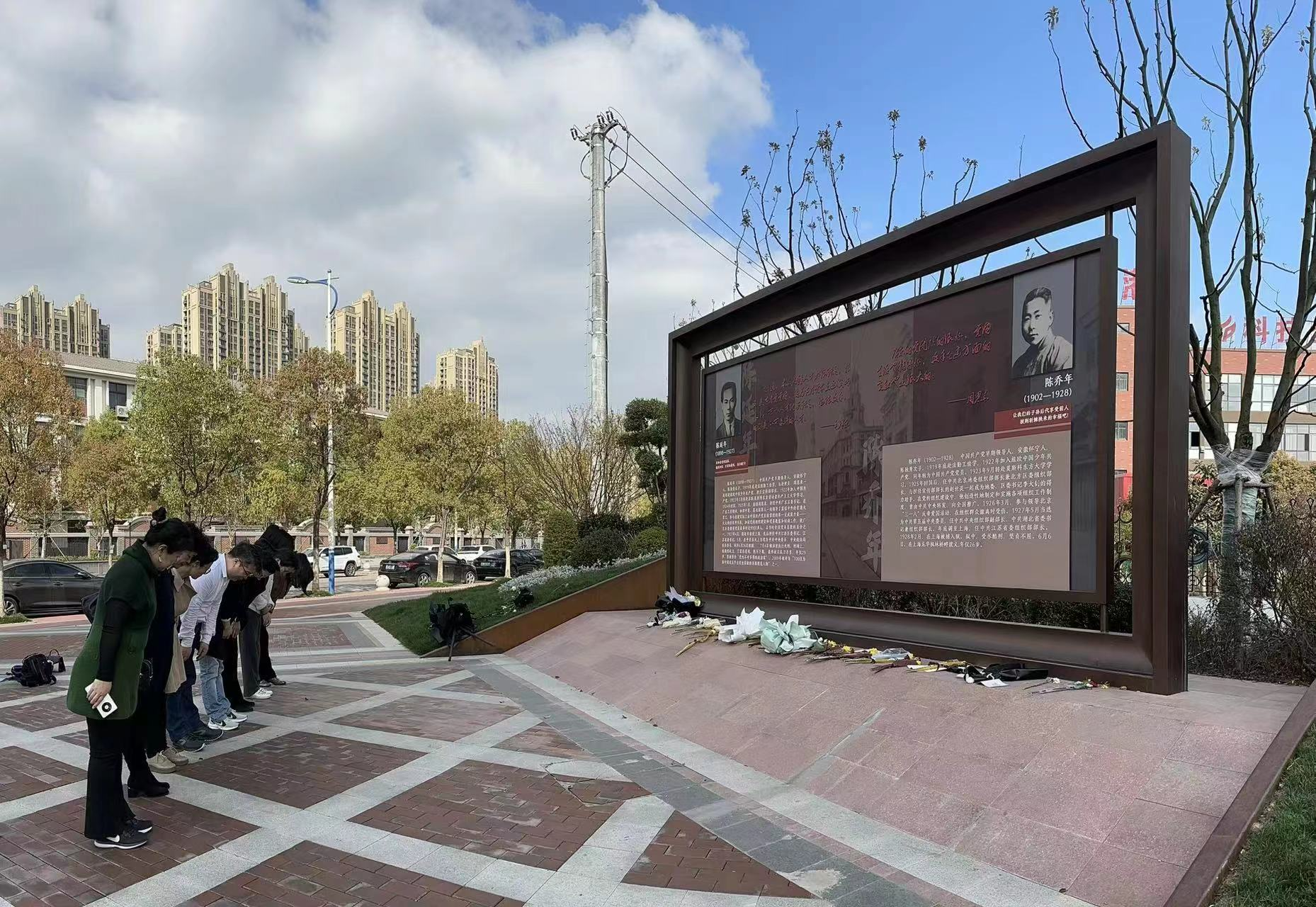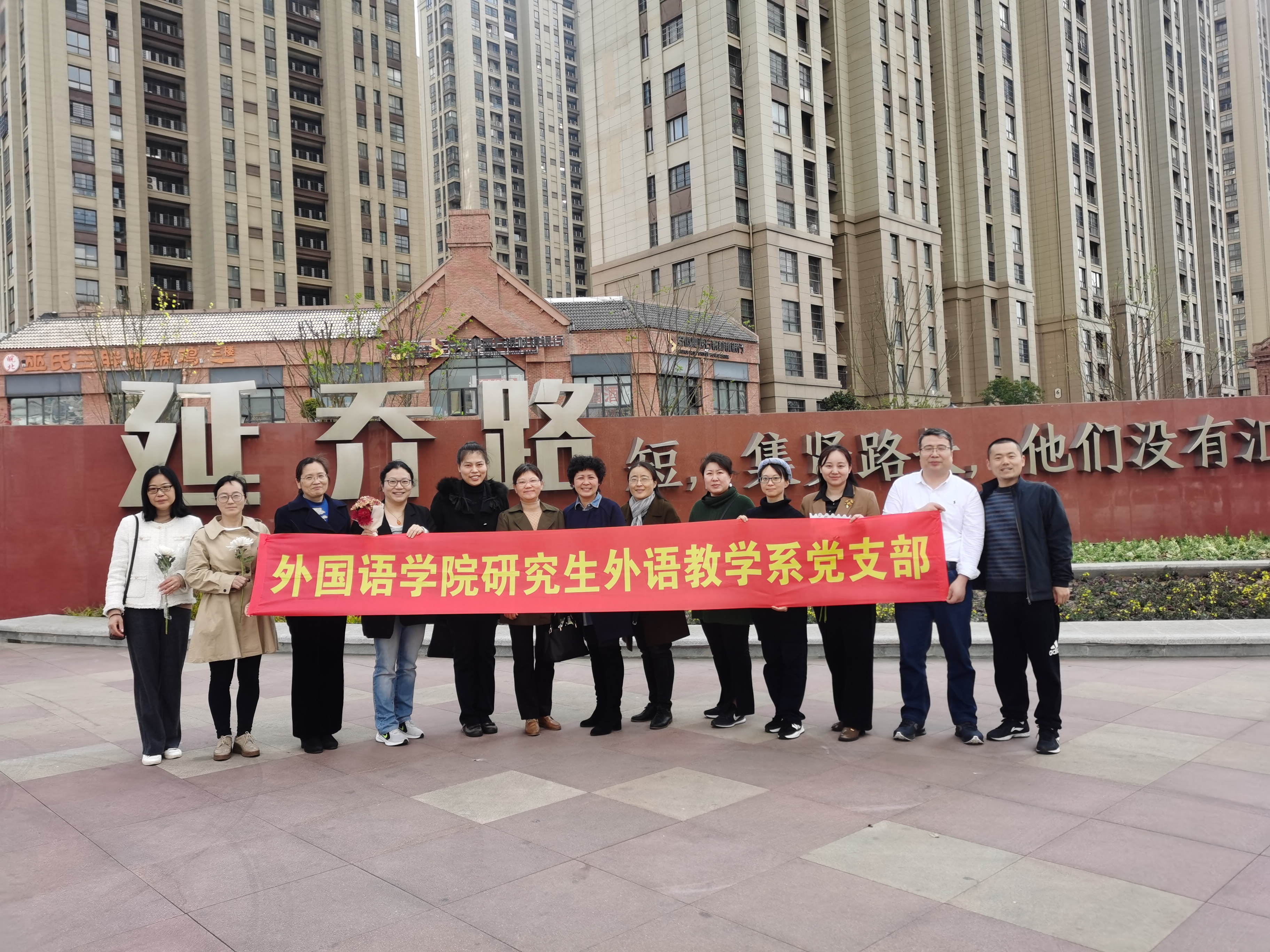 2023年3月30日下午2时许,研究生外语教学系全体党员来到肥西县以陈延年、陈乔年两位革命烈士而命名的延乔路进行纪念活动。教师们驻足瞻仰先烈英雄事迹,为两位英勇就义烈士鞠躬敬献鲜花,寄托对革命英烈无限哀思和崇敬之情。延乔路小学的命名将红色血脉镌刻于人民心中。延乔路虽短,但尽头却是繁华大道。随后每位党员表达对陈延年,陈乔年两位革命烈士为祖国为人民抛头颅,洒热血,不惜牺牲自己生命的英勇大无畏精神的敬仰。