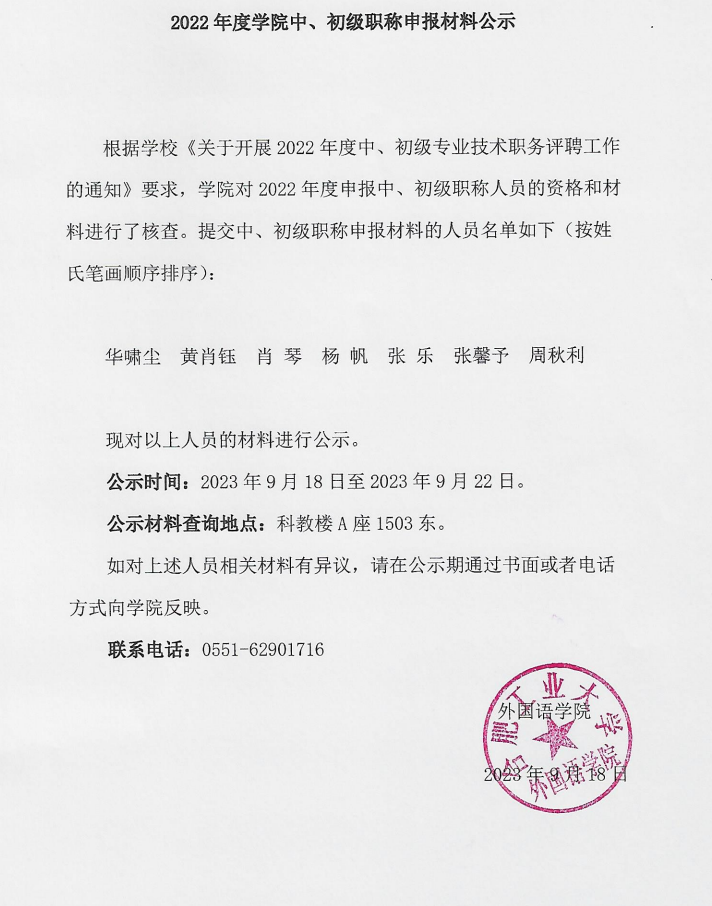 2022年度学院中、初级职称申报材料公示