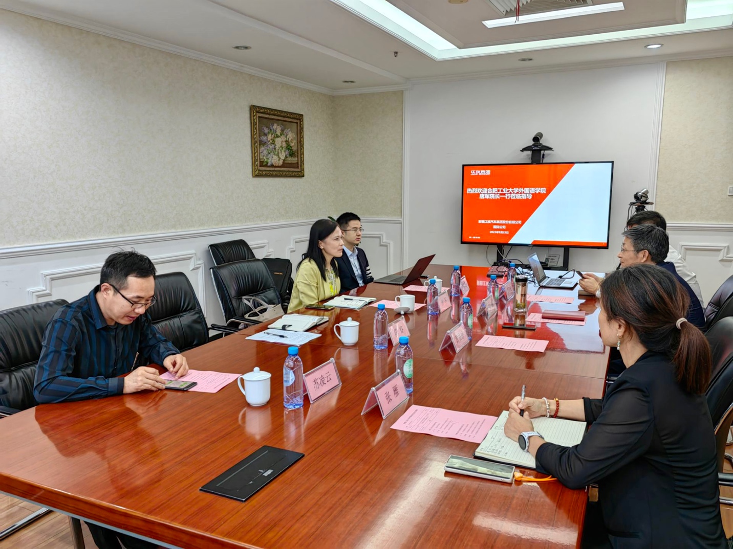 9月25日下午williamhill中国官方网站院长唐军、学科与专业建设中心主任陈睿、国际交流中心主任华啸尘、党政办主任苏凌云一行四人赴江汽集团国际公司开展调研交流。江汽集团股份公司副总经理张鹏、江汽集团股份公司国际公司党委副书记黄福德、江汽集团股份公司国际公司人力资源部部长孙彦宏、江汽集团股份公司国际公司乘用车策略管理部副部长张雁参加了此次座谈。