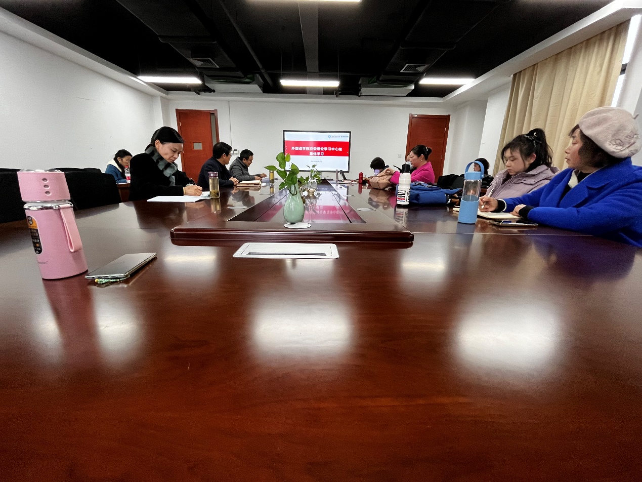 会议传达学习了11月27日、12月8日中共中央政治局会议精神,传达学习了习近平总书记在第十个国家宪法日之际作出的重要指示,在中共中央政治局第十次集体学习时、在上海考察时的重要讲话精神,给武汉大学参加中国南北极科学考察队师生代表的重要回信精神。与会人员还集体学习了《关于进一步提高党委(党组)理论学习中心组学习质量的意见》《国家语言文字关键研究领域领航计划管理办法》《“十四五”普通高等教育本科国家级规划教材建设实施方案》。黄文娇老师作学习交流发言。