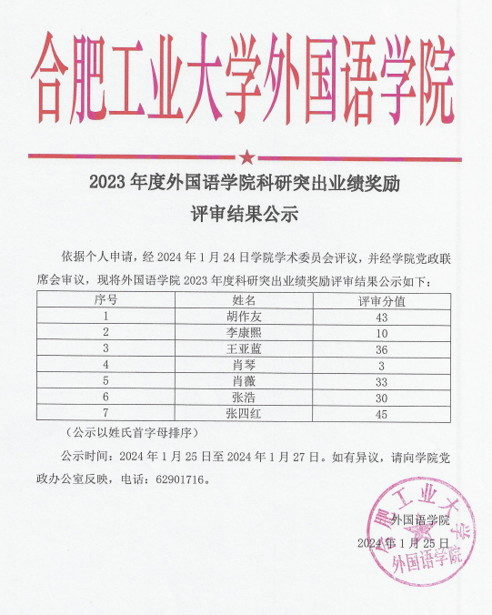 2023年度williamhill中国官方网站科研突出业绩奖励评审结果公示