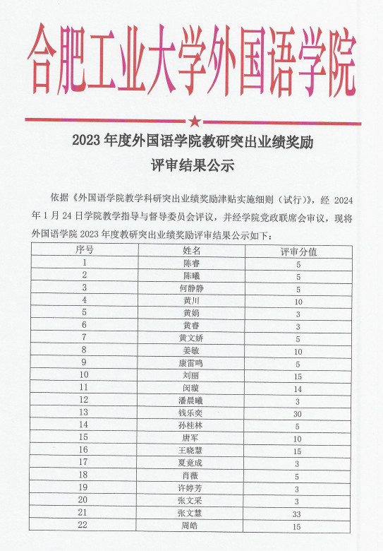 2023年度williamhill中国官方网站教研突出业绩奖励评审结果公示