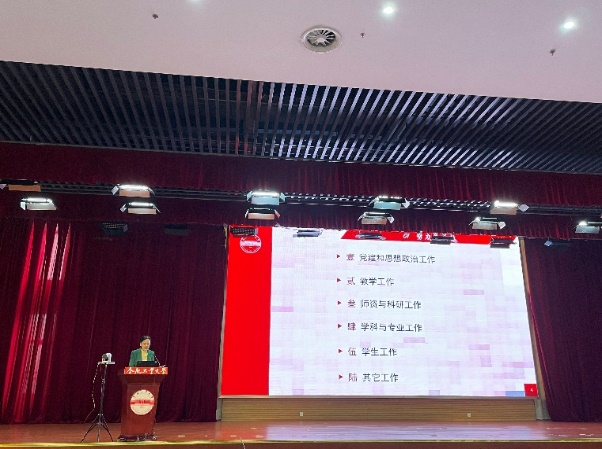 院长唐军基于“实干争春早,奋进正当时”,以“努力见成效”回顾了学院过去一年的主要工作;以“业绩见亮点”对比了近两年工作业绩数据并分享了相关亮点;以“劳动见所得”汇报了2023年年终考核与绩效分配情况;以“反思见不足”梳理了学院师资、学科专业以及教科研成果的不足;以“规划见未来”阐明了2024年的工作要点,期望全体教职工立足本职岗位,以实干笃定前行,以奋斗开启学院未来。