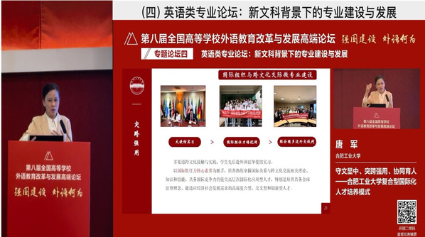 本届论坛高屋建瓴,内容丰富,大会设有主旨报告、教指委论坛、专题论坛等多个模块。其中,专题论坛特别设置“前沿论坛”,聚焦人工智能与外语学科建设,助推外语教育数字化转型与融合创新。同时围绕大学英语、英语类专业与多语种教育,“理解当代中国”课程与赛事,新形态教材以及教师数字素养等重要议题,共探多元化外语人才培养新路径。唐军在第四论坛“英语类专业论坛:新文科背景下的专业建设与发展”做了题为“守文显中、突跨强用、协同育人—WilliamHill官方网站复合型国际化人才培养模式”的报告,分享了学院在英语和印度尼西亚语专业教学改革方面取得的初步成果及在教育数智化时代深化外语教学改革,建设高质量课程体系,培育高水平国际化人才方面的实践探索,报告获得了与会专家的充分肯定和好评,也促进了学院与其他高校同仁们交流互鉴,聚力共书高等外语教育高质量发展新篇章。