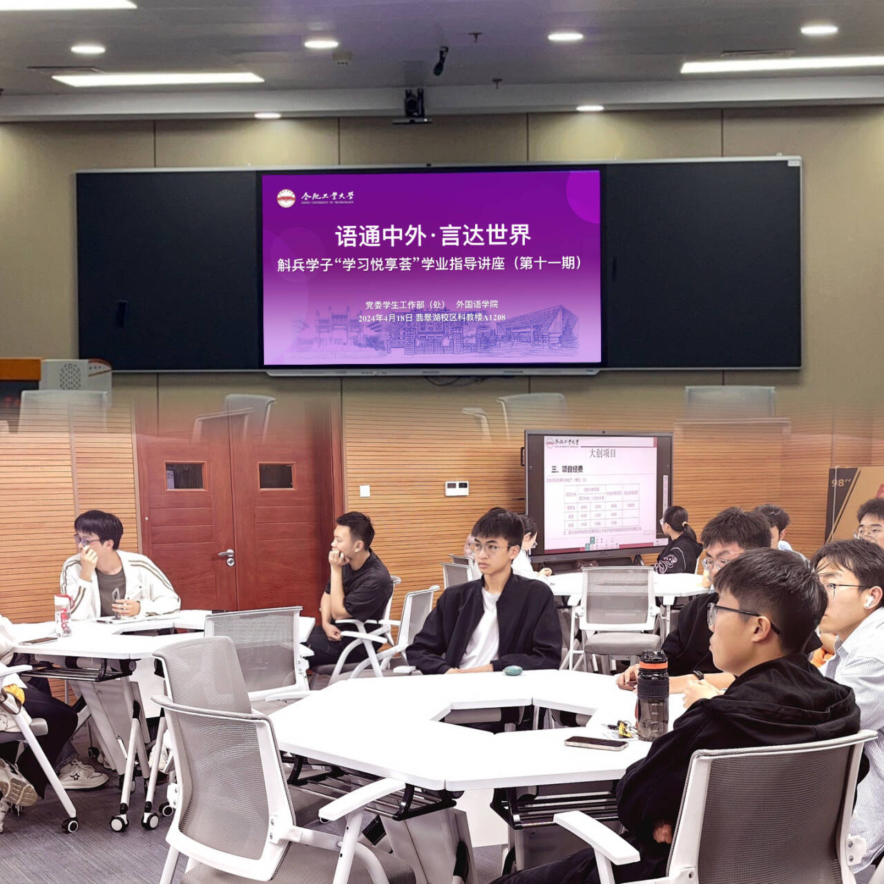 4月18日晚,由党委学生工作部(处)主办,williamhill中国官方网站承办的第十一期斛兵学子“学习悦享荟”学业指导讲座在翡翠湖校区科教楼A1208举行。本期讲座主题为“语通中外,言达世界”,williamhill中国官方网站外语系党支部书记汪晓莉、学院创新创业竞赛负责人田键主讲,学院2023级本科生、对外语专业感兴趣的其他兄弟院系学生到场聆听讲座。