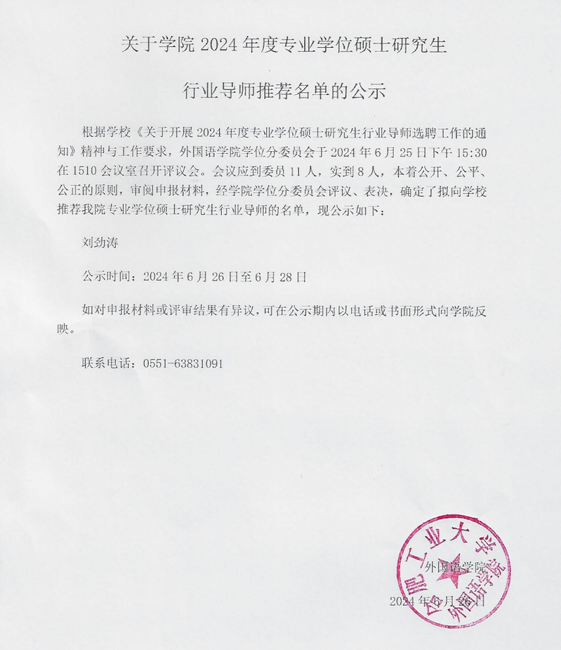 关于学院2024年度专业学位硕士研究生 行业导师推荐名单的公示