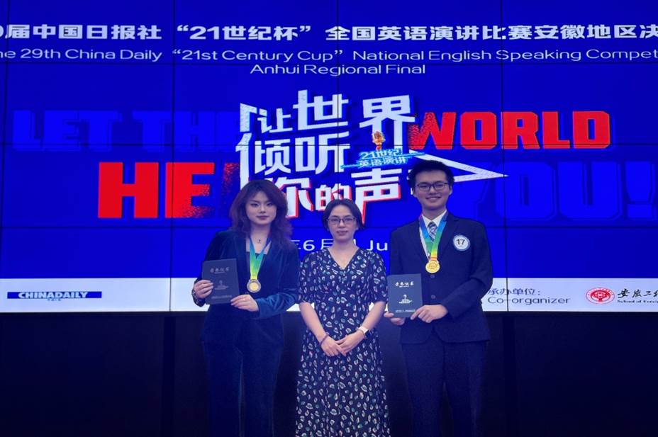 近日,第29届中国日报社“21世纪·可口可乐杯”英语演讲比赛安徽省决赛在安徽工程大学成功举行并圆满落幕。本次比赛汇聚了来自全省十余所高校的21名选手,围绕“传统文化复兴”主题各展风采。经过激烈的角逐,我校经济学院陈安熠同学(潘晨曦老师指导)和朱灵娜同学(郑园琴老师指导)脱颖而出,分获安徽省冠军和季军两项殊荣,成功晋级全国总决赛。