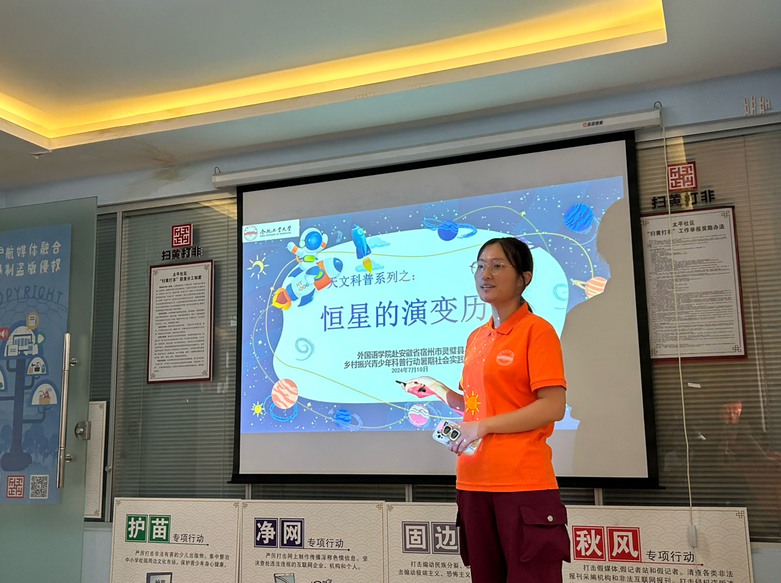 为了更加全面深入地了解当地青少年知识科普现状,“乡村振兴,青少年科普行”团队来到了灵璧县太平社区党群服务中心进行实地调研与宣讲。在与当地社区居民的交谈中,团队成员了解到:近年来,在灵璧县政府与教育局的重视和支持下,青少年科普工作有了良好发展,但要获得长期有效发展,还需要相关专业人士的推动。之后,科普团队成员带领社区孩子们进行天文知识的科普学习—从太阳系大家庭到恒星的演变历史,从千万光年外的星系到我们所生存的地球,科普团队成员既带领灵璧县孩子们领略了宇宙的奥秘,又在一次次讨论与答疑中与大家进行知识的碰撞。身后的屏幕上,是闪耀的宇宙星河;而在屏幕前,则是属于科普团队成员与灵璧县孩子们的“宇宙级浪漫相识”!