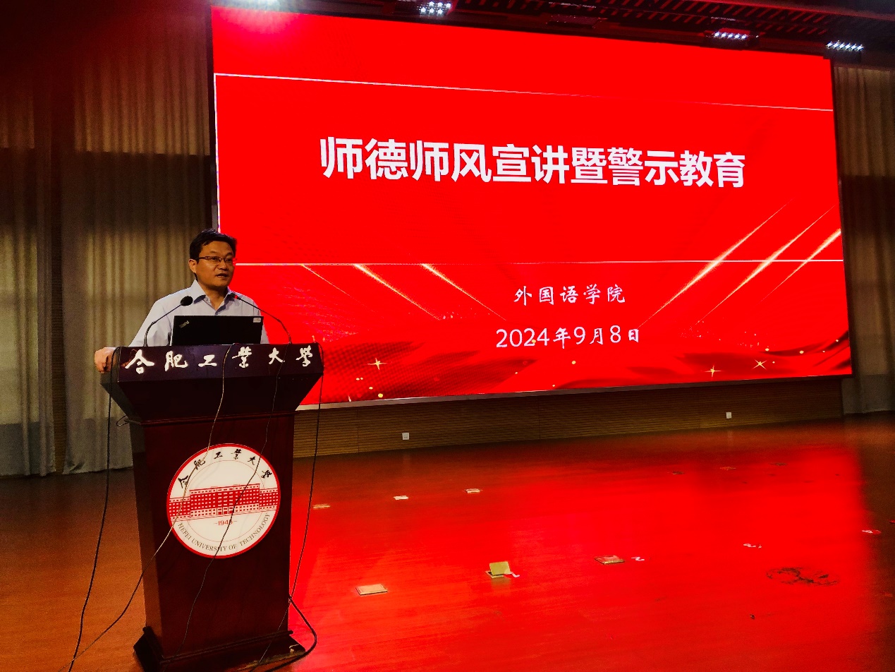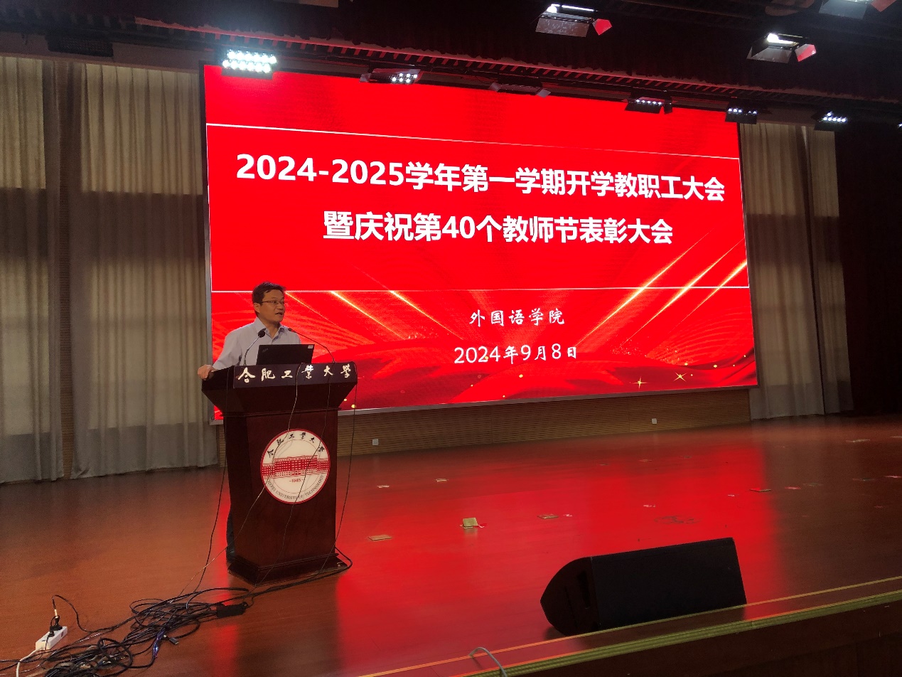 2024年9月8日上午,williamhill中国官方网站在翡翠科教楼A座二楼报告厅举行2024-2025学年第一学期开学教职工大会暨庆祝第40个教师节表彰大会,全体教职工参加了会议,宣城校区英语系教师通过腾讯会议参加,会议由党委书记刘晓峰主持。