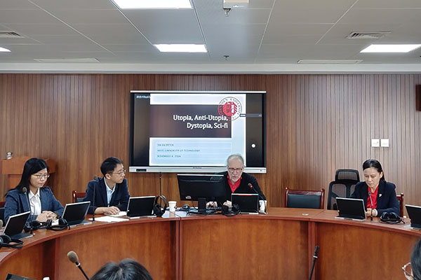 2024年11月4日上午,WilliamHill官方网站在翡翠湖校区科教楼A座1203教室举办了“2024年斛兵外语讲坛‘科研产出大家说’暨研究生交流年会第五场学术报告”。深圳大学特聘教授彼得·海居(Peter Hajdu)应邀为学院师生作题为“Utopia, Anti-Utopia, Dystopia, Sci-fi”的主旨报告。