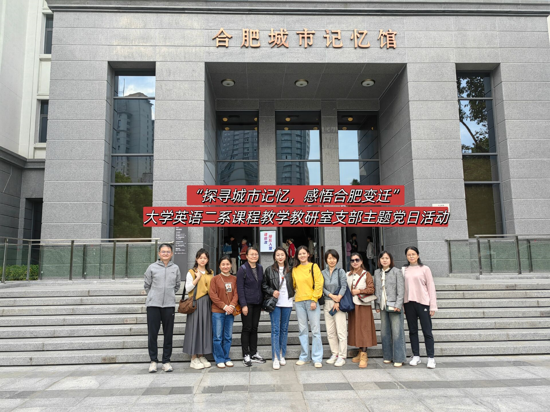 2024年11月13日下午,大学英语二系课程教学教研室党支部在合肥城市记忆馆举行主题党日活动。该馆利用原合肥市政府办公楼建馆,是合肥城市更新示范项目,始建1957年,2018 年录入《合肥市区第一批历史建筑名录》。合肥城市记忆馆不仅是一栋建筑,更是合肥城市发展的一个缩影,通过老照片、老物件以及现代化的展陈和光影手段呈现了合肥城市发展的轨迹和魅力。