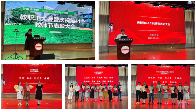 2025年9月4日上午,学院在翡翠科教楼A座二楼报告厅隆重举行2025-2026学年第一学期教职工大会暨庆祝第41个教师节表彰大会。会议由学院党委书记刘晓峰主持,学院全体教职工现场参会,宣城校区英语系教师线上同步参加。