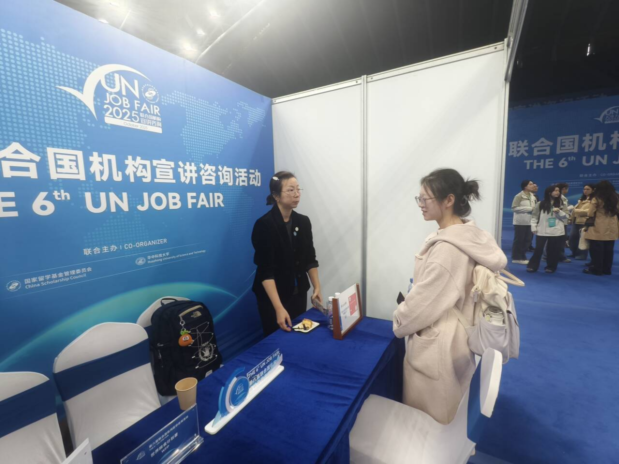 10月25日,williamhill官网师生代表赴武汉参加在华中科技大学举行的第六届联合国机构宣讲咨询活动。活动由国家留学基金管理委员会与华中科技大学联合举办,汇聚联合国人力资源厅、联合国教科文组织、联合国粮食及农业组织等23家国际组织,提供多领域的就业实习岗位招聘咨询。