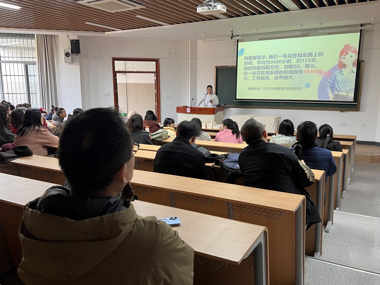 为提升教职工生活品质与工作效率,营造积极健康的工作生活氛围,12月3日下午,学院工会联合三孝口街道城隍庙社区党委、新时代文明实践站、合肥市乐友健康产业管理有限公司及合肥市家协向阳花志愿服务总队等单位,于翡翠湖校区顺利开展“整理与收纳的美学”专题活动,吸引学院众多教职工积极参与。活动以“教师赋能、点亮有序生活”为主线,采用专业讲授与动手实践相结合的形式,聚焦教师群体实际需求,助力教职工系统掌握科学收纳技巧,优化办公与家居环境。