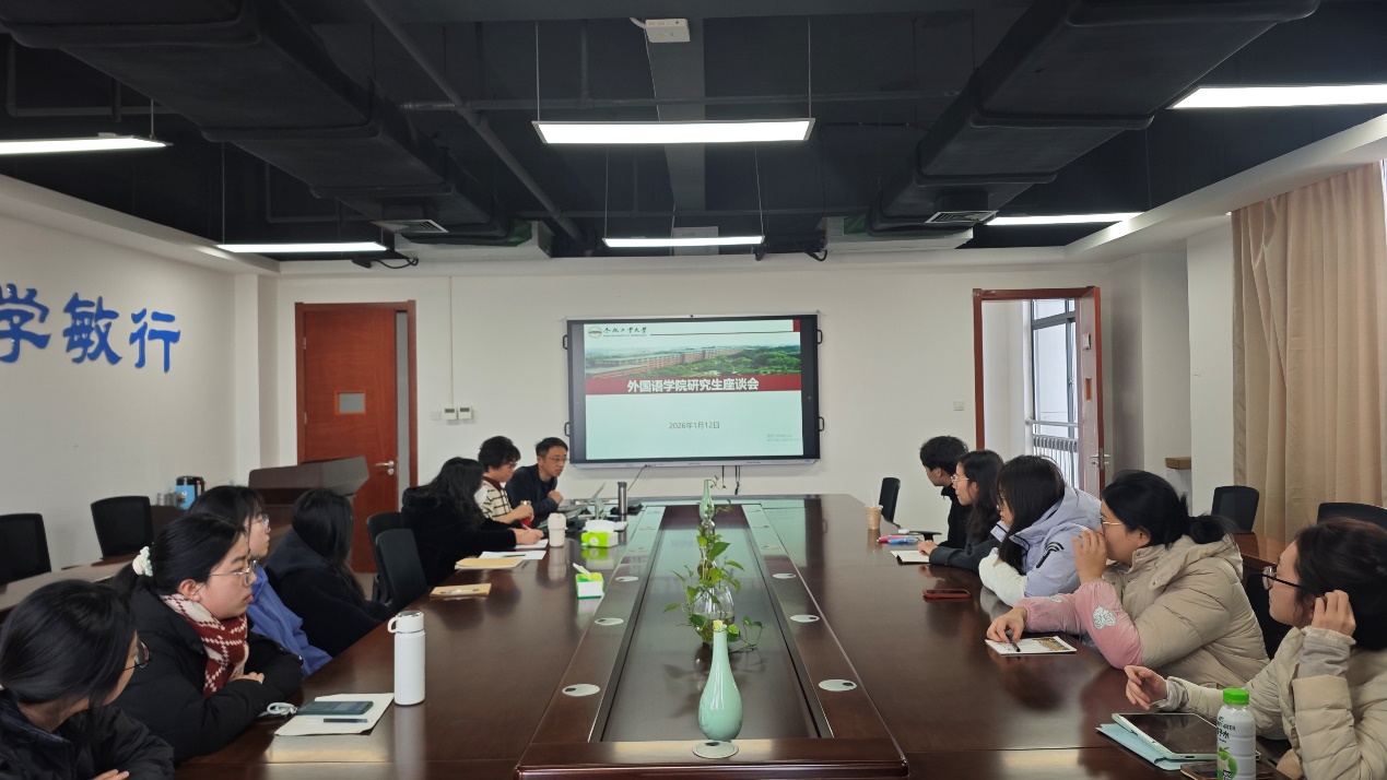 2026年1月12日上午,学院于1510会议室举行研究生座谈会。本次座谈会旨在搭建师生沟通桥梁,倾听学生心声,共同探讨研究生培养过程中的关键议题,进一步提升人才培养质量与学科建设水平。学院副院长陈曦、外国语言文学学科带头人汪晓莉、学科与专业建设中心主任陈睿、研究生辅导员金惠萍出席会议,与来自各年级、各专业的研究生代表进行了深入交流。