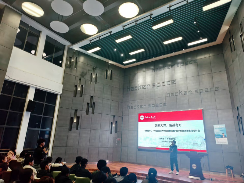 讲座伊始,季云峰老师结合自身指导的多组获奖项目案例,分享了多年积累的参赛指导创新理念与实践经验,具体阐述了如何将语言学科与科技、商科、工科等不同领域知识深度融合,如何用跨界思维打破单一学科局限形成独特创新优势;随后从评审视角深入解读了获奖项目的核心共性,强调优秀项目需兼具突出的创新性、扎实的实用性与高效的团队协作能力,同时明确了选题要紧扣时代需求、创新性需具备可落地性等关键评判标准;针对文、理、工不同学科背景学生的特点,他分析了文科在文案撰写、逻辑表达上的优势、理科在数据分析、理论支撑上的特长以及工科在技术转化、实物呈现上的亮点,提出“扬长避短、互补组队”的全学科备赛策略,指导学生主动突破学科壁垒凝聚创新合力;在项目全流程指导中,他系统讲解了从选题调研、精准组队到路演PPT打磨、现场答辩技巧的完整备赛要点,重点分享了如何筛选志同道合且能力互补的团队成员、如何通过明确分工与定期沟通提升协作效率,以及如何用故事化表达让路演更具感染力;最后通过全国特等奖(全国第六名)项目的真实案例,生动讲述了选题从校园生活痛点中获取灵感的过程、研究阶段攻克技术对接难题的关键举措,以及备赛后期根据模拟评审反馈调整展示重点的实战经验,让在场学生深受启发。